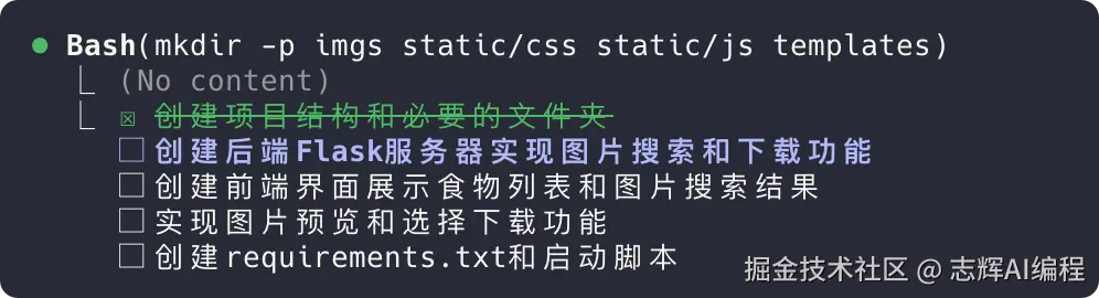可以看到 Claude Code 工具开始都规划了些任务列表,然后从任务列表开始一个一个的开始解决。每完成一个就划线掉,还先试试绿色的,然后紫色的就是下一步需要执行的任务,白色的就是还未执行的。