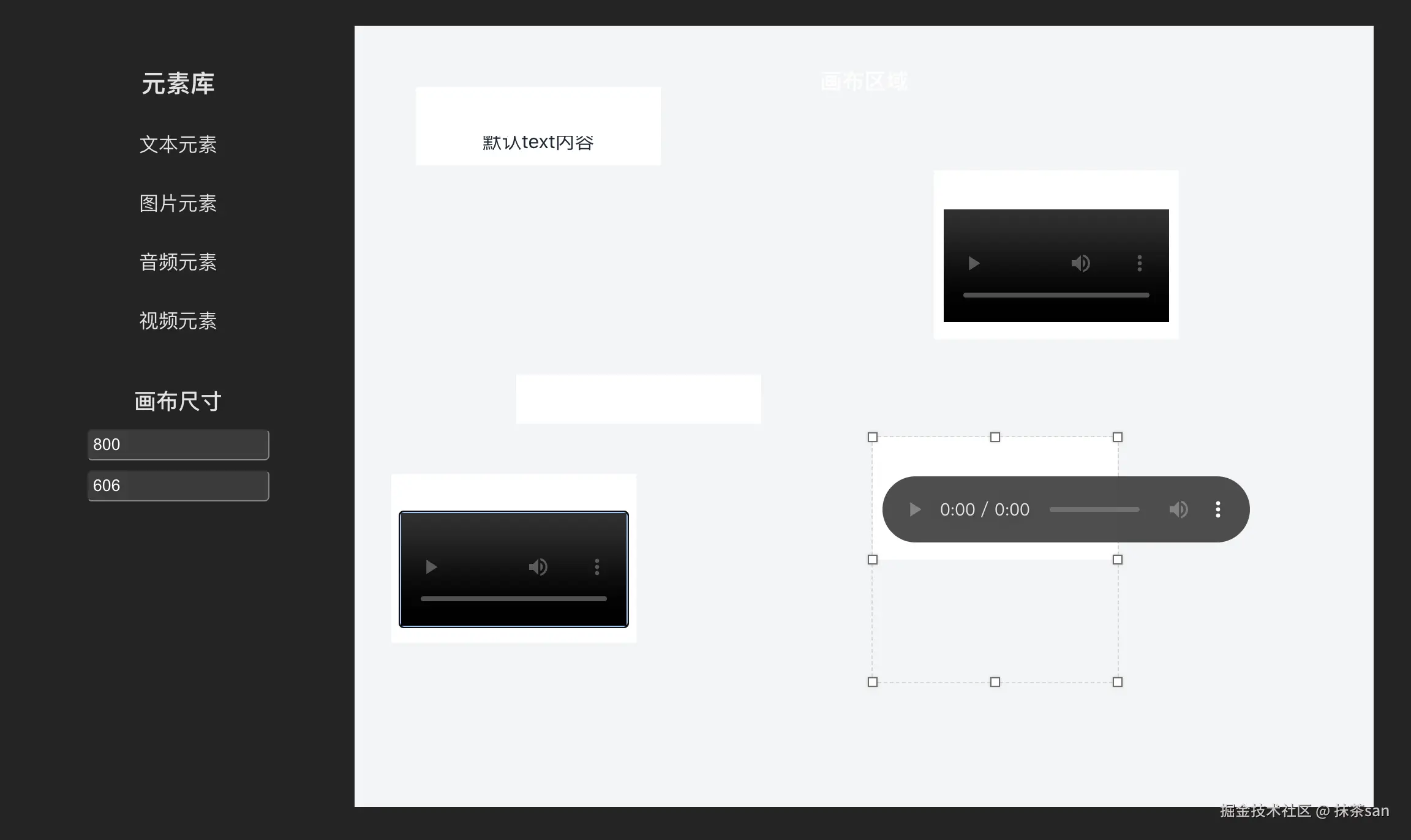 我:建立一个画布,可以调节画布尺寸。 画布左侧放置文本、图片、音频、视频四个元素,可以通过拖拽加入画布内,画布内的元素可以缩放