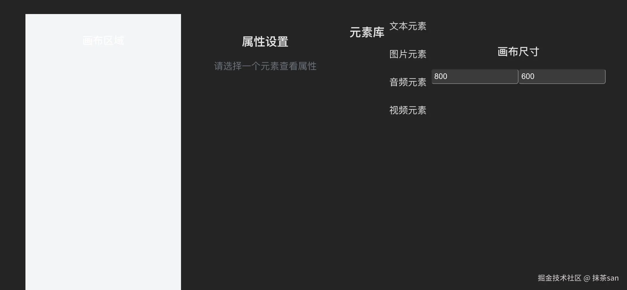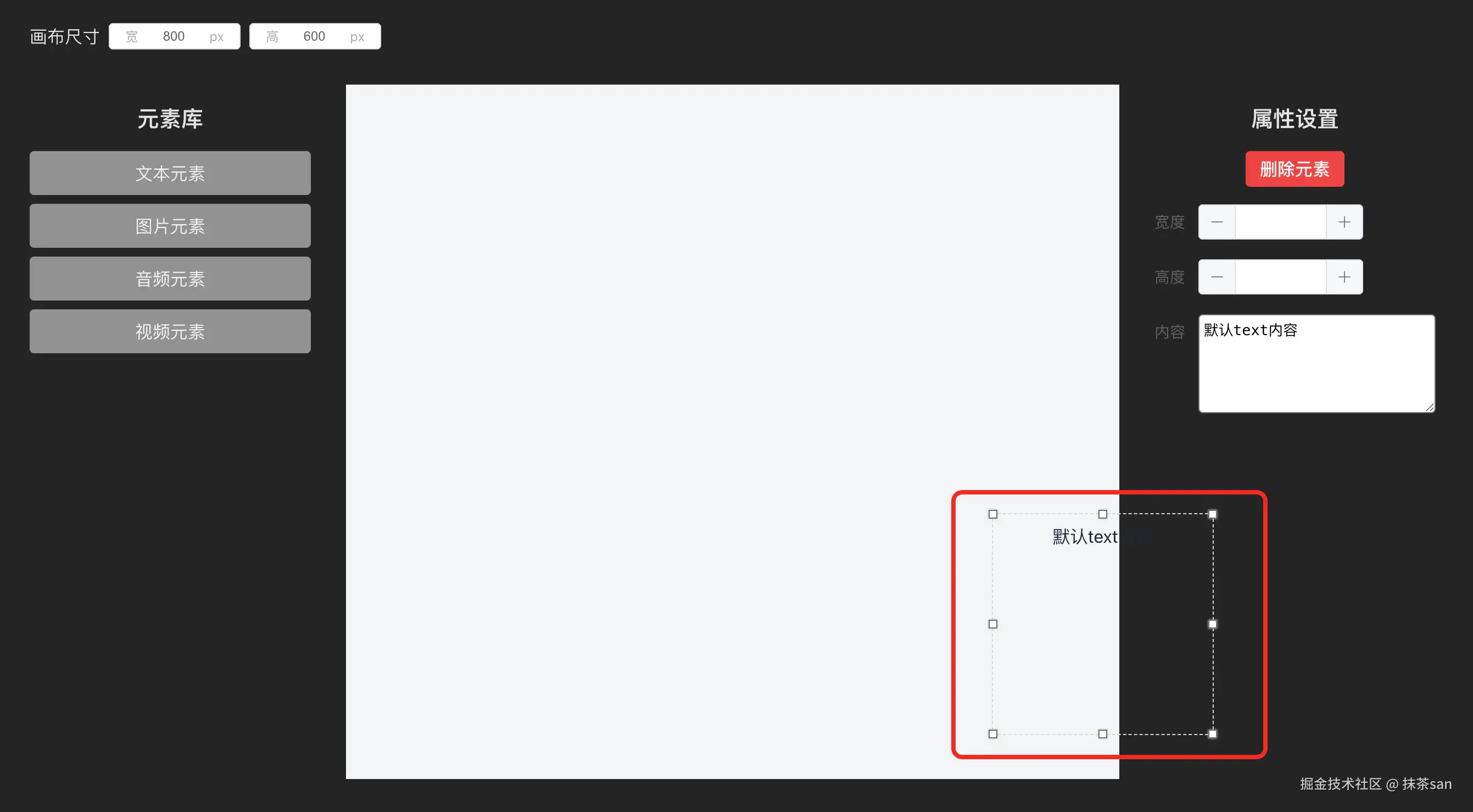 我:画布内元素增加删除功能。画布右侧增加功能区域,可以实时修改画布内当前当前选择元素的尺寸、颜色、src 等元素相关属性。