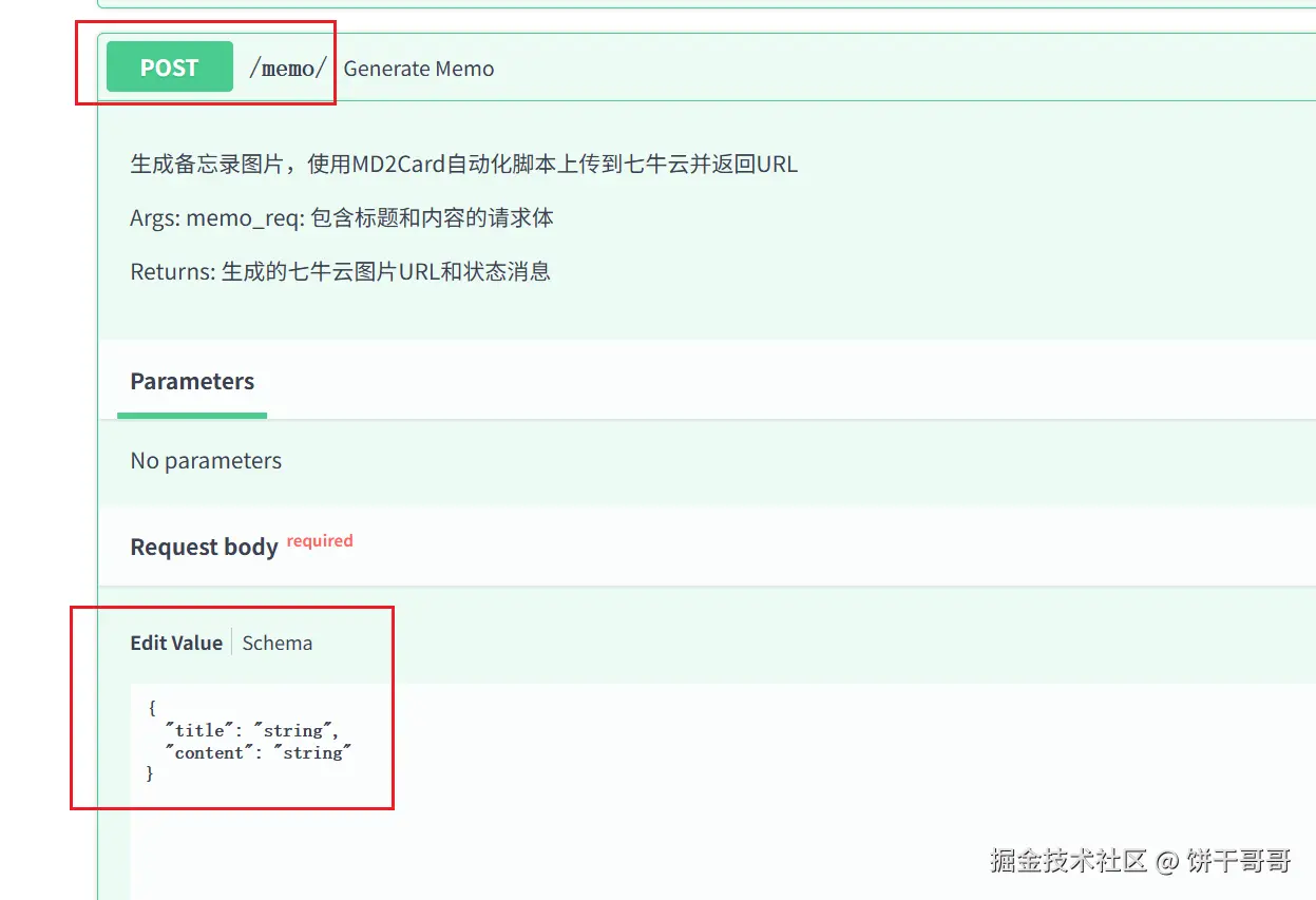 下面这里依然源自前面的Fastapi接口的图,需要传入两个参数:title和content