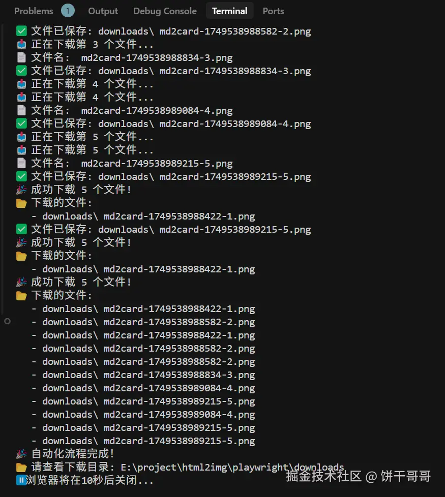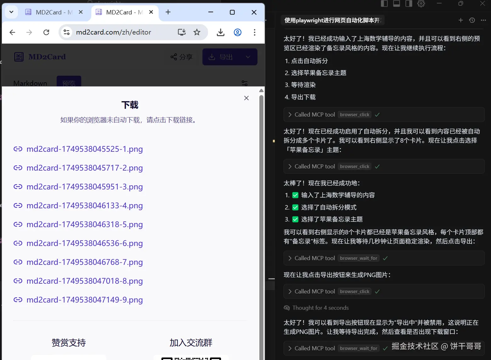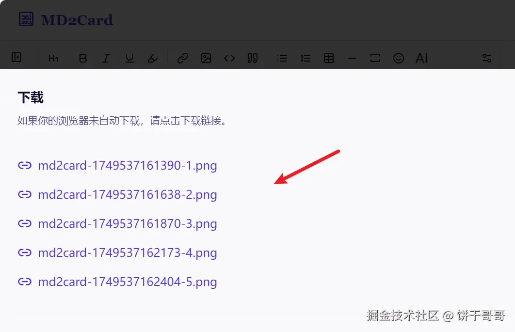 对于下载窗口,多个下载链接的 名字格式前缀是固定的「md2card-」,可以根据这个找到下载链接点击再把下载图片下载下来