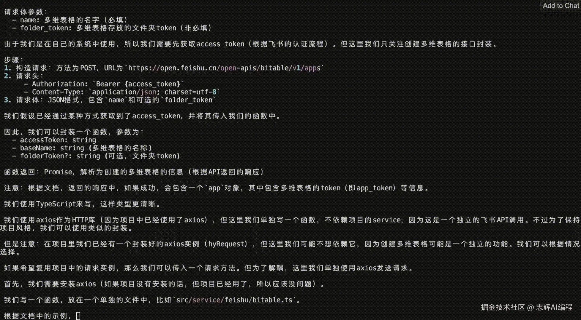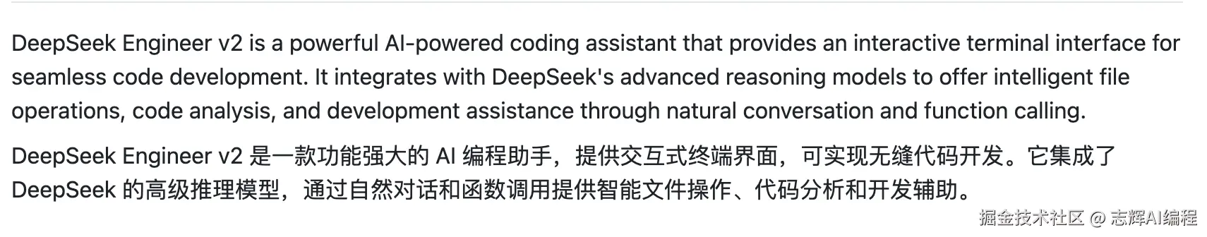按照惯例,可以先让他解读下代码,这里不过就不能添加rules等文件了。当然我们可以让DeepSeek帮我们写到README.md文档里去,省去我们写文档的烦恼。