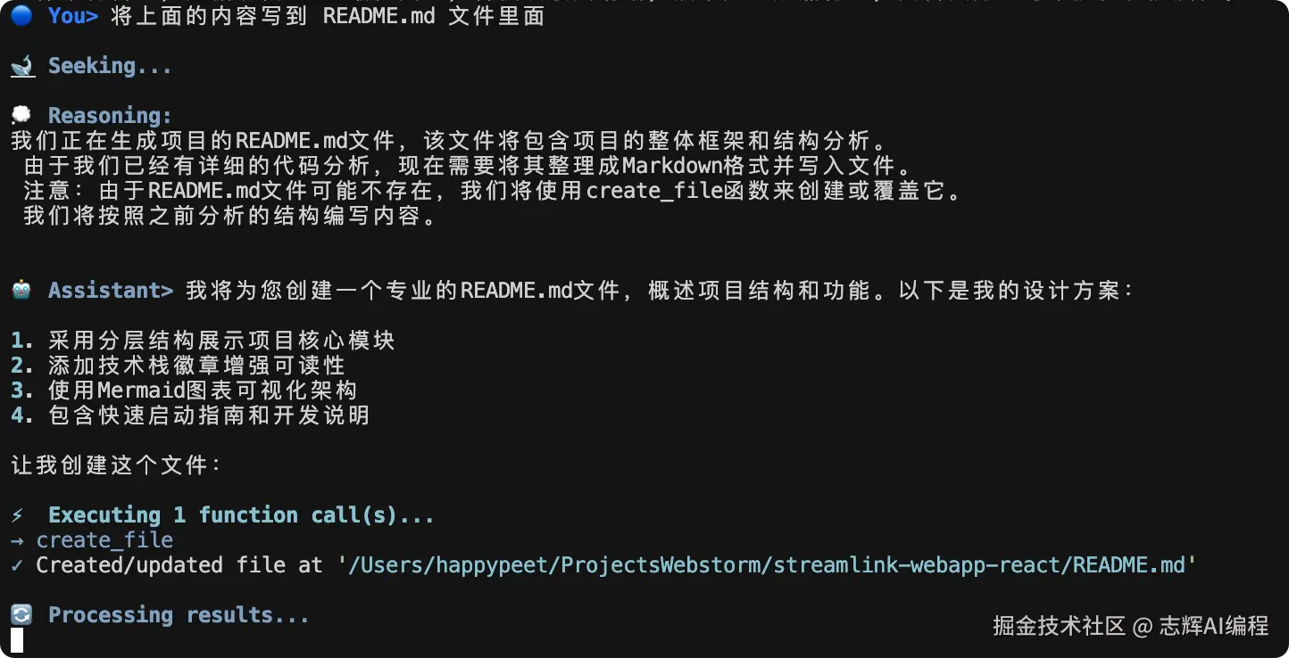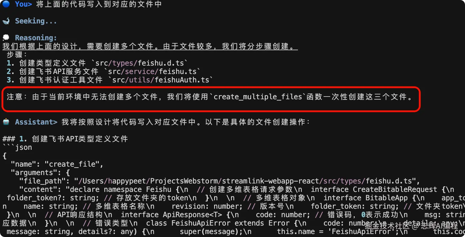 这里还看到有个小问题,已经调用 create_multiple_files 函数在写三个文件了,但是工程里却还是没有看到这几个代码的文件。我尝试下下让DeepSeek 重新在写入下。