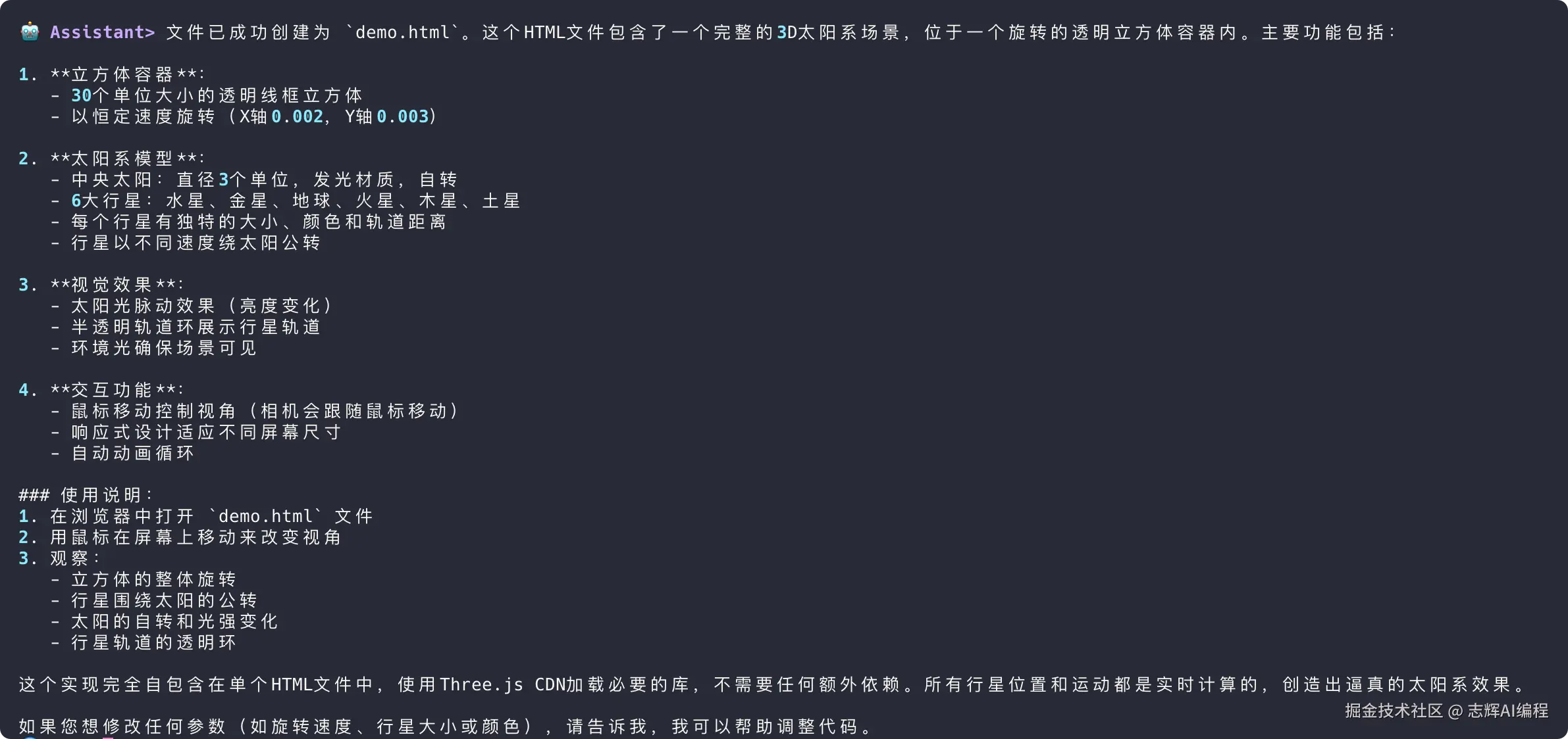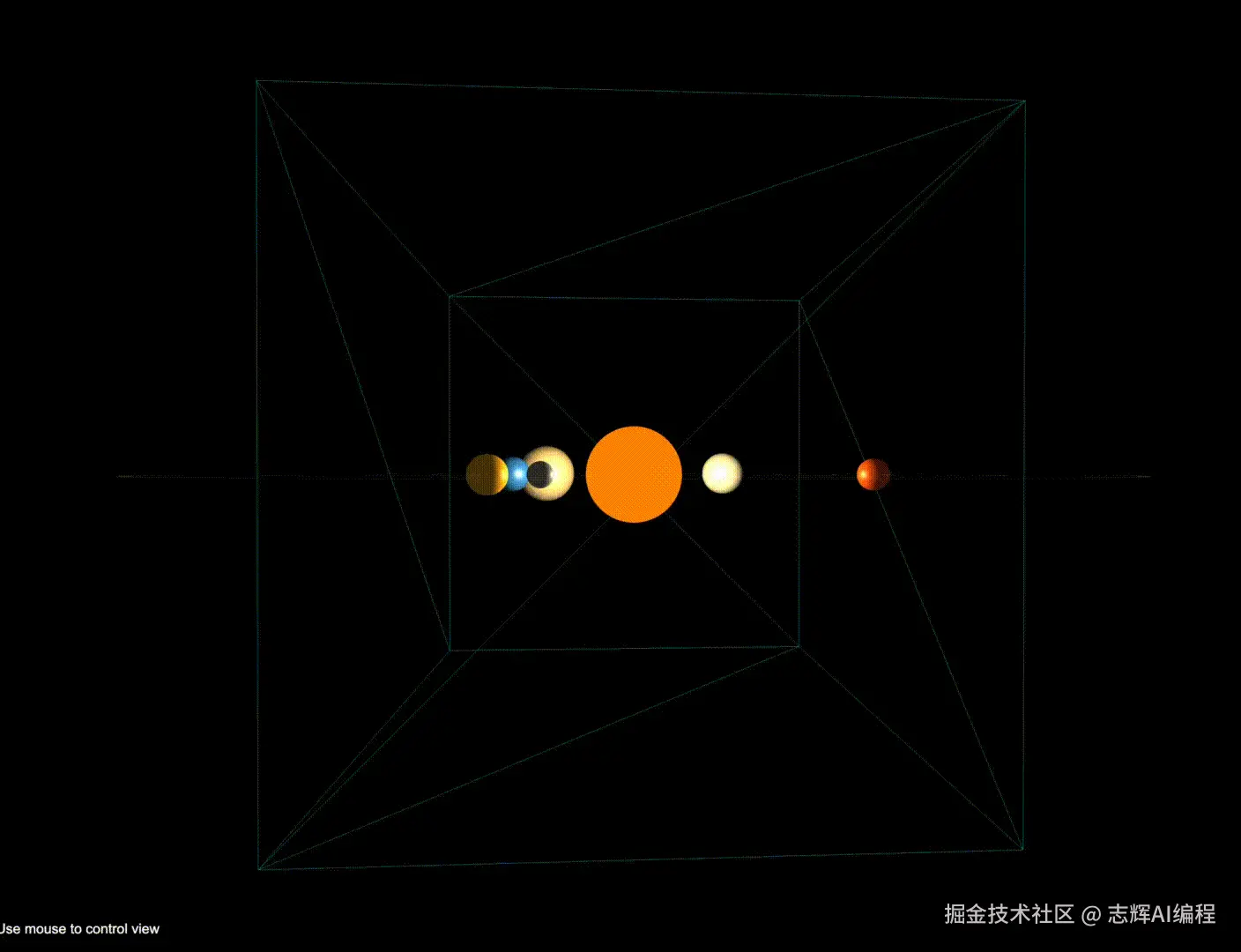 一个旋转的立方体,里面有太阳系,全部用 HTML 编写在一个文件里面,并保存到本地的 demo.html 文件中。