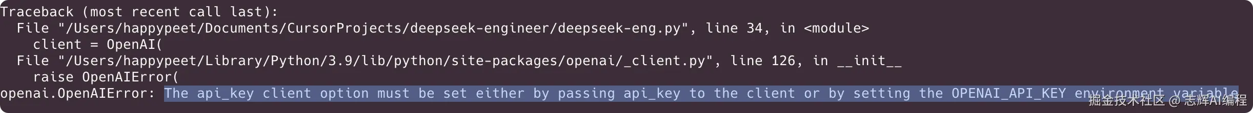 解答:没有配置API key的文件,在项目的根目录配置.env 文件,并配置DeepSeek的API key信息