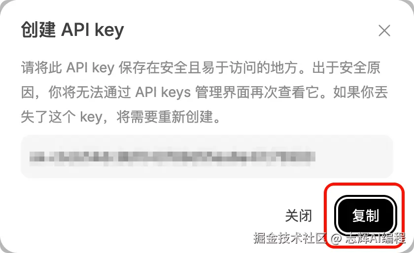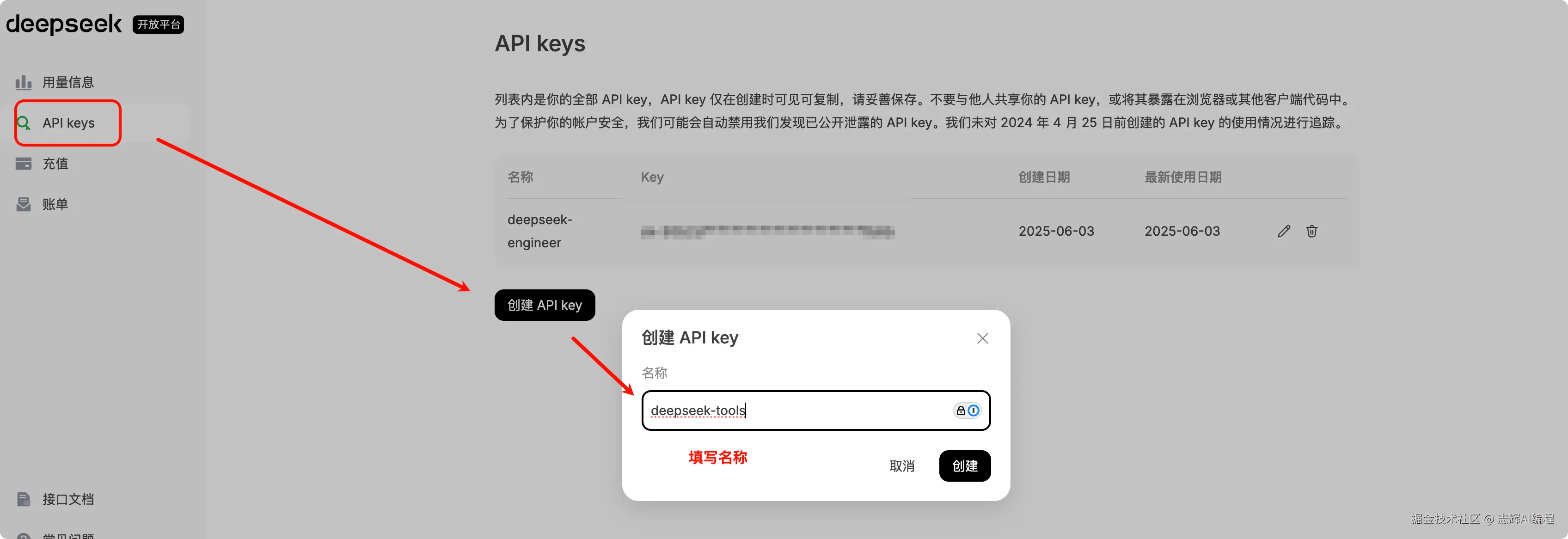 切换到左侧菜单到「API keys」,创建一个API key,如果你之前保存的有,用之前的也行。重新创建一个新的也可以。