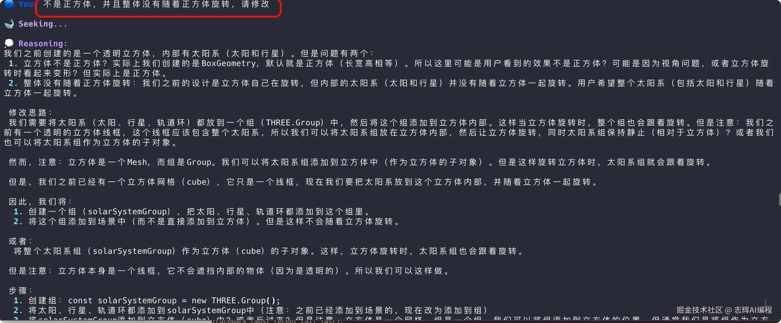 这里有个小缺点就是,不能像 agent 模式那样,让我确认就可以直接写入文件,你还需要再次让 DeepSeek 把上面的代码写入到的文件中去。