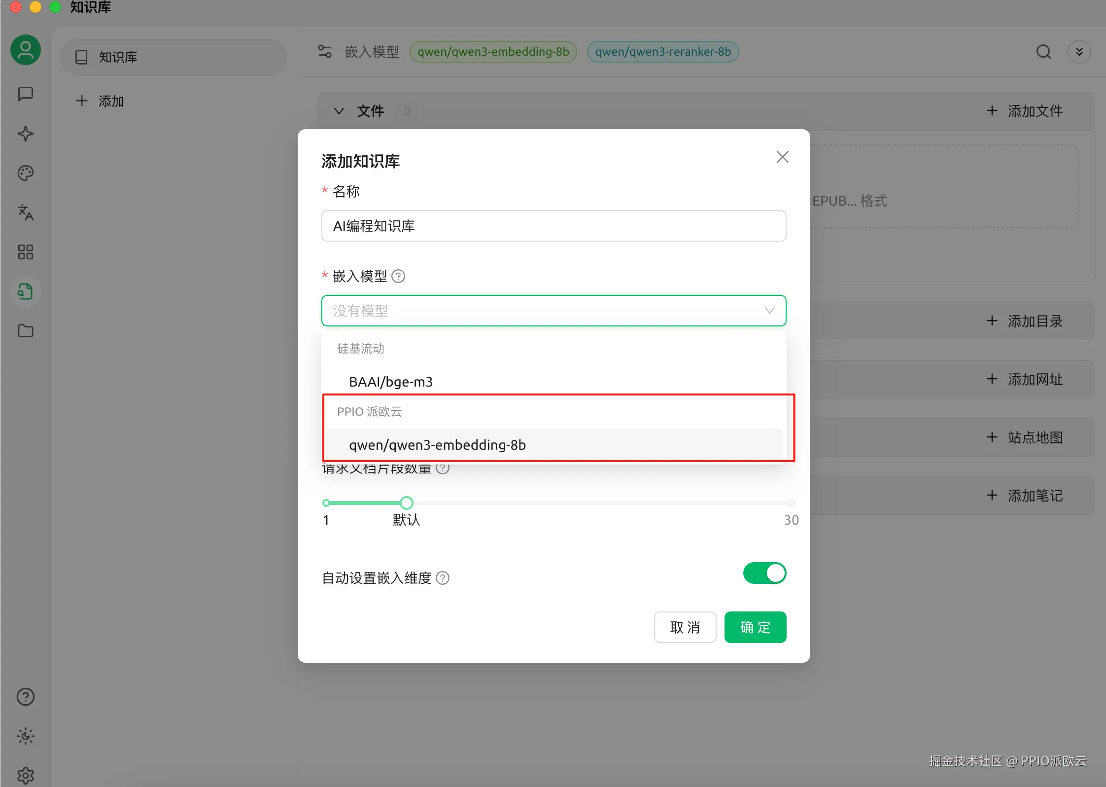 在导航栏左侧点击知识库并添加,自定义名称后,下拉嵌入模型,会看到刚刚添加的 Qwen3-Embedding-8B 模型,将其添加。