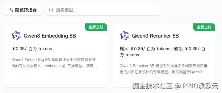 PPIO 平台上线了 Qwen3-Reranker-8B 与 Qwen3-Embedding-8B,开发者可以灵活组合表征与排序模块,实现功能扩展。