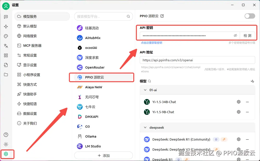 打开Cherry Studio,点击设置,选择【PPIO派欧云】,输入官网生成的API密钥。
