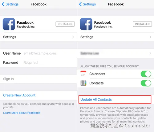 点击“更新所有联系人”将 iPhone 联系人与 Facebook 应用同步。