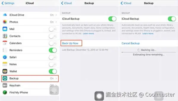启用联系人同步后,向下滚动到 iCloud 备份并单击“立即备份”选项。