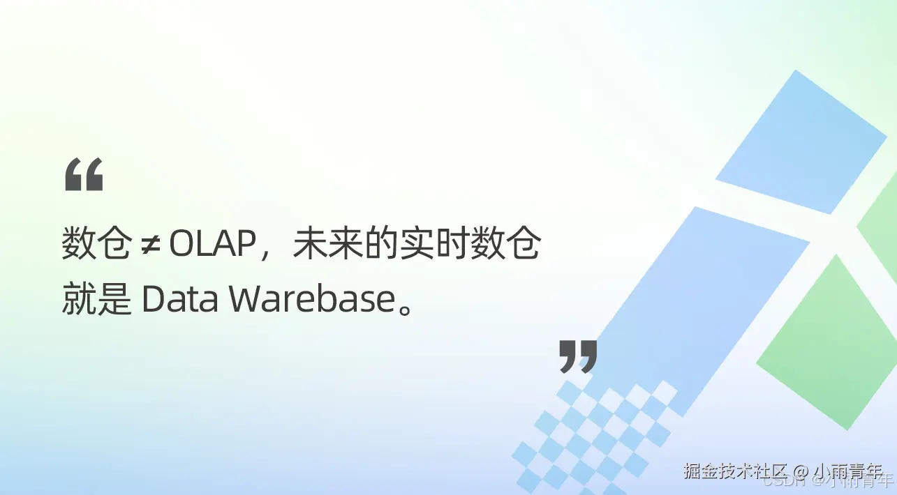 但是光有 HTAP 是不够的,未来是一个多模数据库的时代,首先要有很好的 OLTP 和 OLAP 的能力和性能,其次要支持实时增量物化视图做数据的 Instant Transform、文本搜索、向量搜索、文档数据存储和查询,甚至还要支持对湖上数据的查询,因此我们提出了 Data Warebase 的概念,它是 Database+Data Warehouse 的合集,是未来多模数据库的一个新范式。
