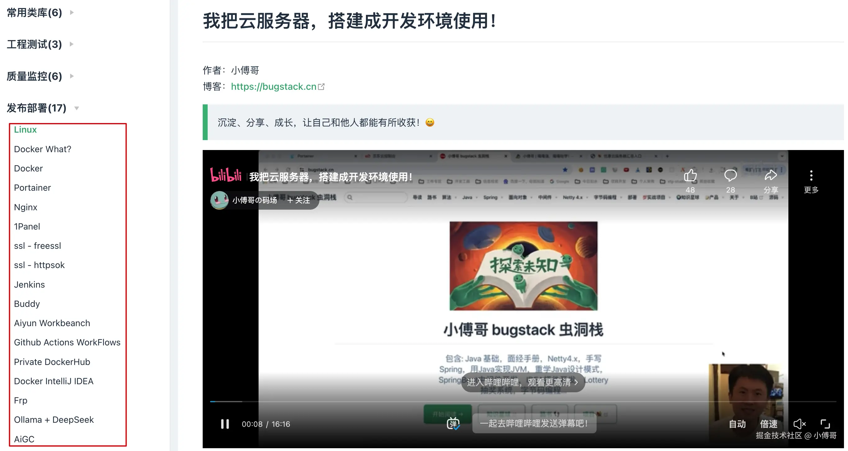 云服务器处理安装完基础的 Docker 环境外,还需要安装 MySql、Redis、MQ等,这里小傅哥也提供好了相关的教程,可以使用。
