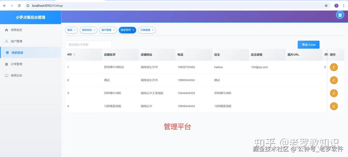 商家管理: 支持对平台内商家进行查询,删除,修改,编辑等。