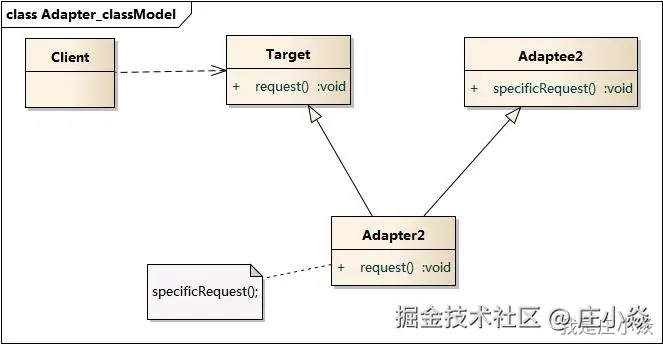实现方式:适配器通过继承的方式,同时继承被适配者类(Adaptee),并实现目标接口(Target)。