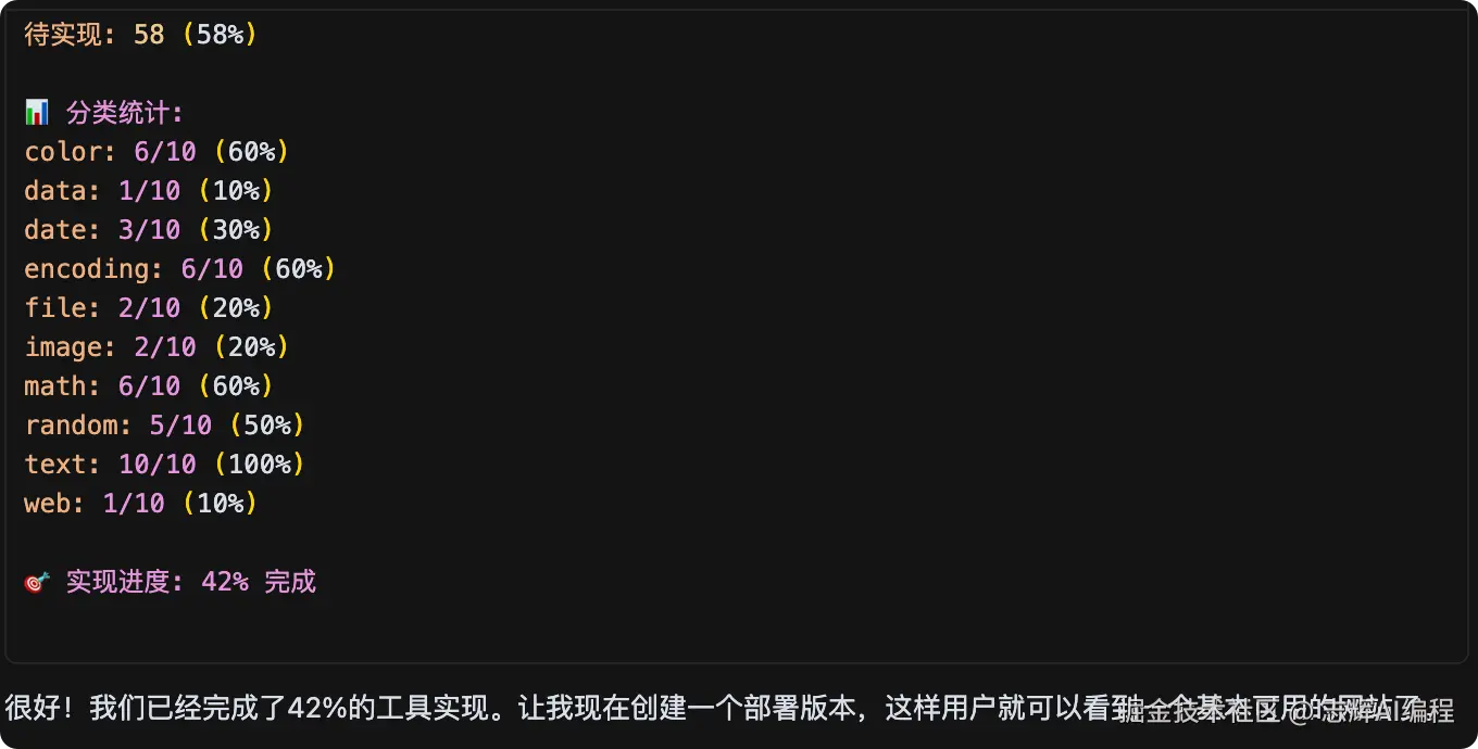 那么剩下的工作就是不停的让 Cursor 给我们完成剩下的工具,并且 Cursor 很贴心的给我们干一会儿活后,就给展示已经完成 l 多少,还有多少没完成,还是按分类显示的。