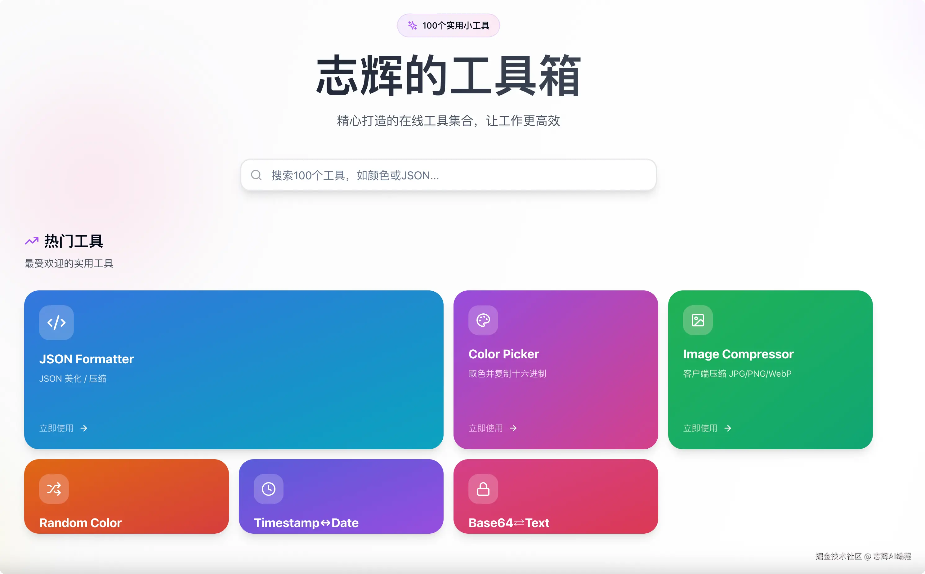 刚好前天摸鱼时间搞了个工具网站,这也是感谢 @方可乐 交流后的灵感,类似这种工具站交给 AI 还是很快就可以搞定的,因为交互原型功能确定后,剩下就是让 AI 帮我们开发各种小工具的功能了。