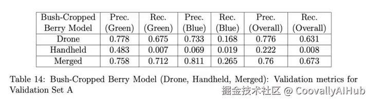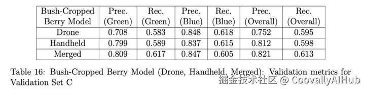表14、15和16分别展示了使用灌木裁剪浆果模型(无人机、手持和融合)在验证集A、B和C上的验证结果。这次我们看到融合模型在所有验证集上的总体召回率都优于无人机和手持模型。手持浆果模型在集A和B(表14和15)的总体精确率和召回率上都表现最差,正如在全图像验证时观察到的那样(见表10),但在集B(表15)的绿色浆果精确率上出人意料地表现良好。对于集C,融合模型获得了最佳的总体精确率和召回率,手持模型的结果仅略差。这表明集C中的无人机图像几乎具有与手持图像相同的空间分辨率。我们相信,融合模型在未来无人机拍摄的图像上会表现最佳,这些无人机的摄像头分辨率只会继续提高。为了比较,表17单独展示了使用相同的灌木裁剪融合浆果模型验证集A、B和C的结果。这里的结果与在全图像上验证时的结果类似(见表10),但观察到集C的召回率显著提高,因为模型不再需要检测背景灌木上的微小浆果,这在全图像验证时是困难的。