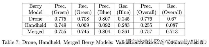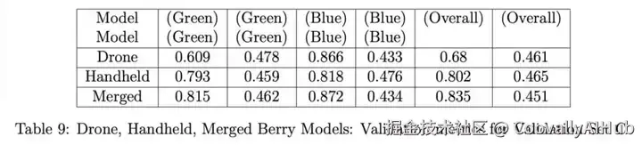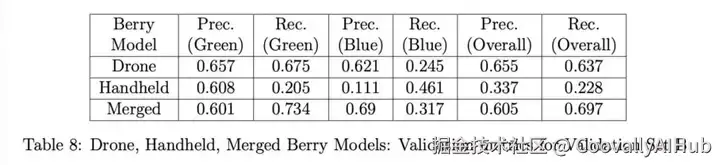 验证结果:表7、8和9分别展示了三种浆果模型(无人机、手持、融合)在验证集A、B和C上的精确率和召回率。对于集A和B(表7、8),无人机浆果模型在所有模型中具有最高的总体精确率;然而,融合模型具有显著更高的总体召回率和略好的蓝色浆果精确率。另一方面,手持浆果模型在所有类别中表现最差。特别是绿色浆果的召回率极低,表明该模型未能检测到许多绿色浆果,特别是在背景灌木上显得更小的那些,这使得模型更难检测它们。此外,蓝色浆果类别的精确率也相当低,这表明手持浆果模型在正确检测蓝色浆果方面表现不佳。至于验证集C(表9),性能发生反转,融合模型现在具有最高的总体精确率,而总体召回率仅比无人机和手持模型略差。观察到手持模型的总体召回率相比表7、8中的结果显著提高。然而,所有三个模型在总体召回率上都表现不佳。对假阴性的检查发现,它们是背景灌木上的浆果,虽然被标注但因尺寸太小或阴影太重而无法被任何模型检测或识别为浆果。总体精确率的结果证明,与单独使用无人机和手持图像训练相比,使用合并的无人机和手持图像训练有助于改进(融合)浆果模型,总体召回率仅略有下降(但绿色浆果召回率最佳)。
