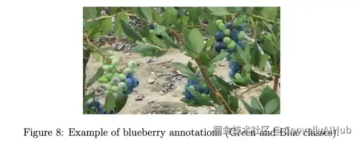 为每颗可见浆果绘制紧密包围的矩形检测框,按颜色分为两类:青果(Green)与成熟果(Blue)(示例见图8)