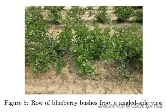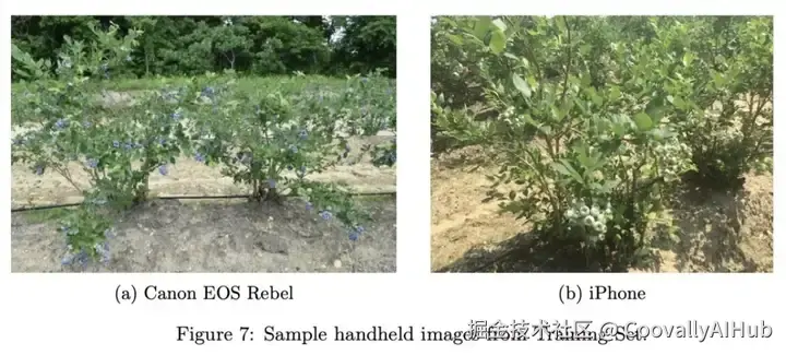 数据包含两种高丛蓝莓(Vaccinium corymbosum)品种"Duke"和"Draper"的灌木图像(静态照片与视频帧),采集自新泽西州南部多个露天蓝莓农场。为增强数据多样性,同时使用了手持设备(含手机)和无人机摄像头进行拍摄。尽管原始采集图像总数超过千幅,但由于标注工作耗时且资源有限(具体挑战将在下文讨论),实际用于模型训练的仅为其中部分样本。