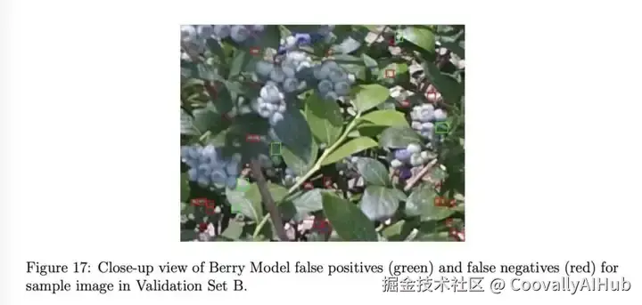 我们的浆果模型结果突显了标注浆果和训练模型时的挑战。由于尺寸小而难以辨别的浆果,特别是背景灌木上的那些,可能导致主观标注,从而产生模糊的真实标注。许多假阳性检测可以被认为是浆果的真实检测,这取决于人的视力,但由于分辨率低而难以确定。此外,部分隐藏浆果的遮挡、绿叶对绿色浆果的伪装以及阴影浆果,使得训练一个准确的浆果模型相当具有挑战性。