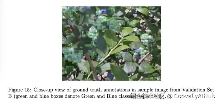 图15、16和17展示了集B中的样本图像(B2),但绘制了不同类型的检测框:真实标注(图15)、预测结果(图16)以及假阳性和假阴性(图17)。仔细检查假阳性可以发现,其中一些可能是浆果,但难以清晰辨别,这解释了为什么它们没有被标注。