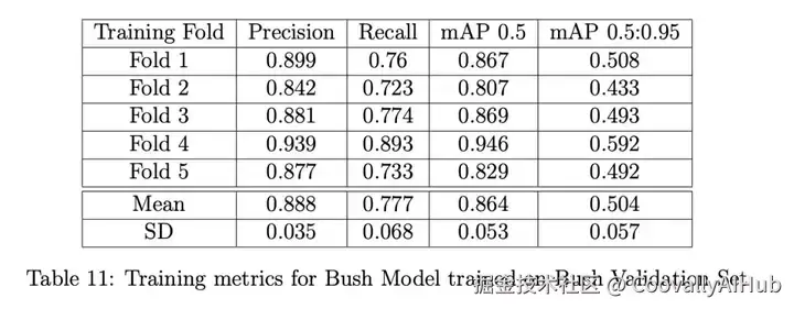 训练/验证结果:表11给出了在灌木训练集上训练的灌木模型的训练指标。表12给出了在灌木验证集上验证的灌木模型的验证指标。两个表都显示了约90%的高精确率,以及从训练的高70%到验证的低80%的良好召回率。对真阴性(未检测到的灌木)的检查表明,灌木模型难以检测图像边缘的那些灌木。幸运的是,这不是问题,因为灌木模型的目标是检测和追踪前景灌木。