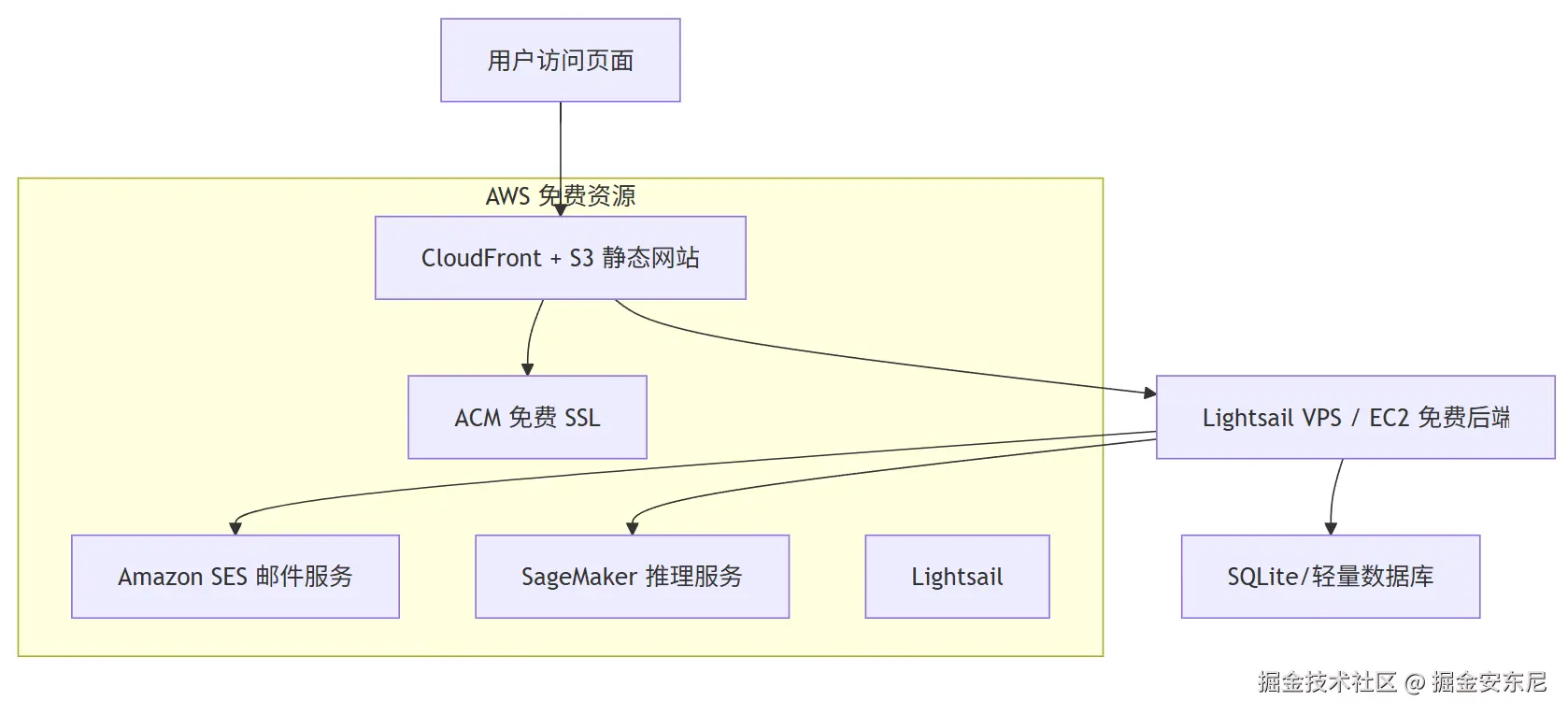 这个架构的核心目标:用最少的钱跑通链路,实现功能验证、用户交互与模型能力一体化。刚好!这些,在亚马逊云科技免费套餐中都有覆盖。