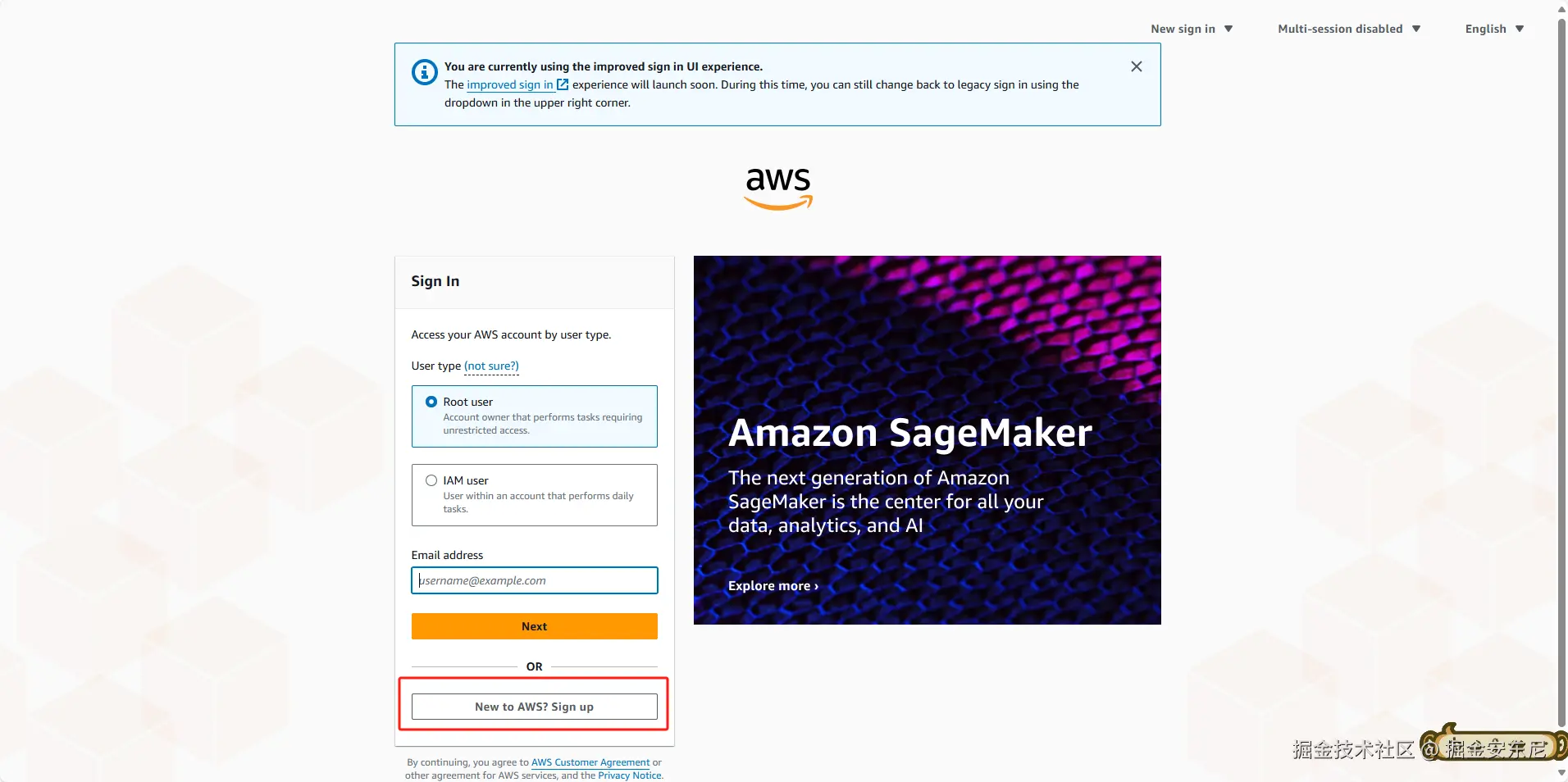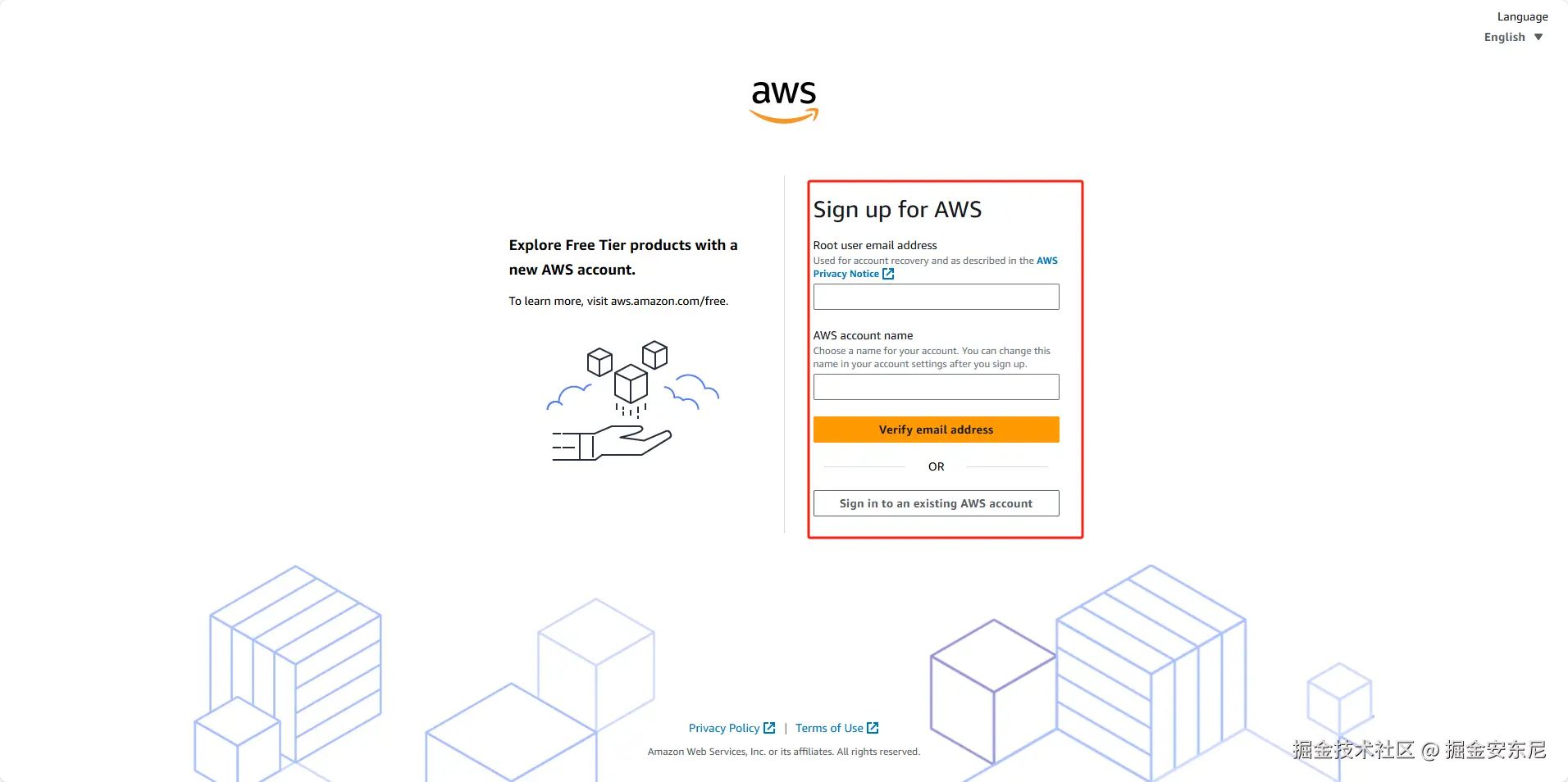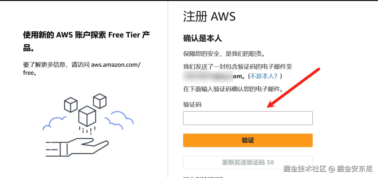 打开亚马逊云科技的官网 ,然后点击右上角的创建用户按钮,创建新的账户:然后输入要创建的邮箱地址,然后点击验证邮箱地址,在邮箱中找到验证码然后输入: