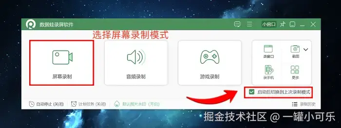 注意:要是想偷懒,下次启动时勾选右下角 “启动后自动用上次的录制模式” ,省得重复调参数。