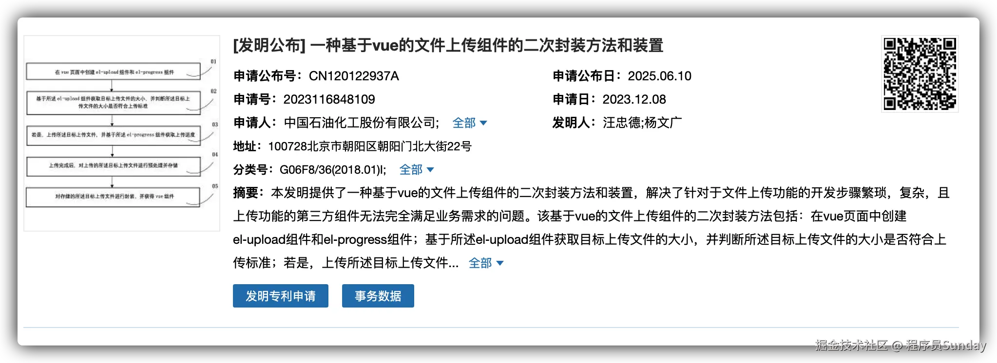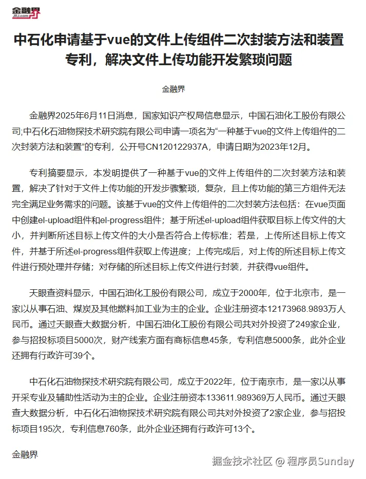 最近刷新闻的时候,看到了一个让我眼前一亮的标题:中石化申请基于 Vue 的文件上传组件二次封装方法和装置专利,解决上传功能开发繁琐问题。