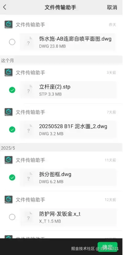 3、然后选择发送cad图纸的微信好友或者群聊,就可以到里面的cad图纸。点击需要导入的图纸前面的圆圈,然后点击确定;
