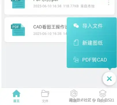 1、打开CAD看图王,点击首页右下方的+,点击导入文件;