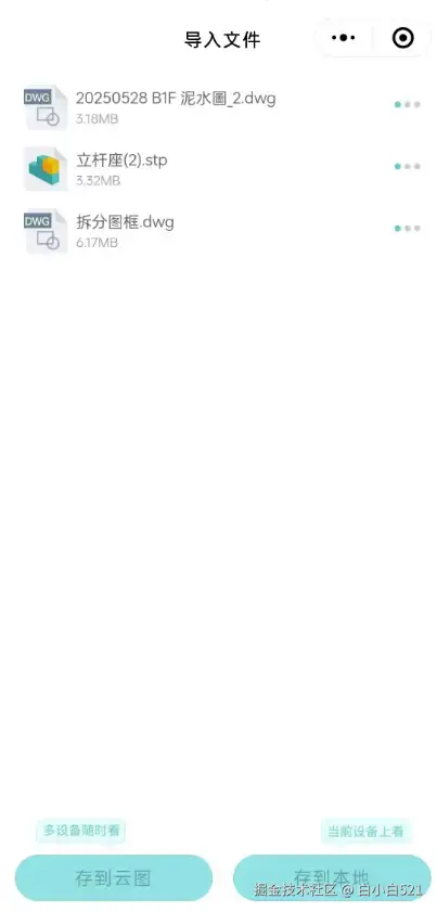 可以看到刚才选择的图纸,下方有两个按钮,点击存到本地按钮后,会弹出本地文件夹路径,选择一个文件夹,会将图纸保存到手机本地。