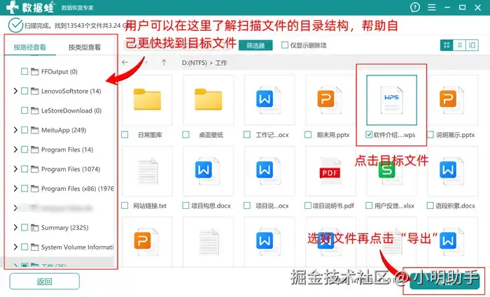 步骤2: 等待软件扫描结束后,扫描出来的文件会显示在页面中央,如果用户扫描出来的文件数量过多,可以选择使用“筛选器”或者“搜索框”等辅助工具,减少文件的搜索范围;找到文件后点击表示选择,点击“导出”;
