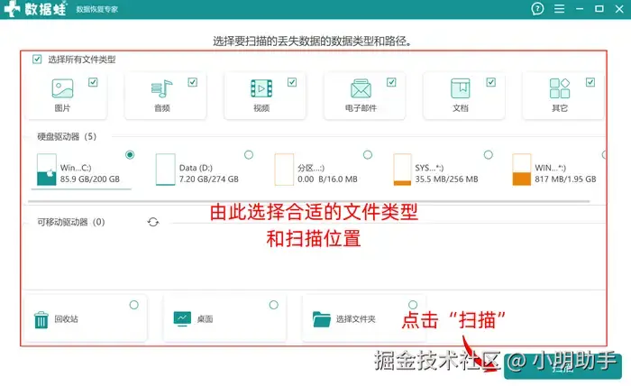 步骤1: 点进数据 蛙恢复专家的首页后,可以在上面选择需要恢复的文件类型,再需要选择进行扫描的电脑位置,点击“扫描”;