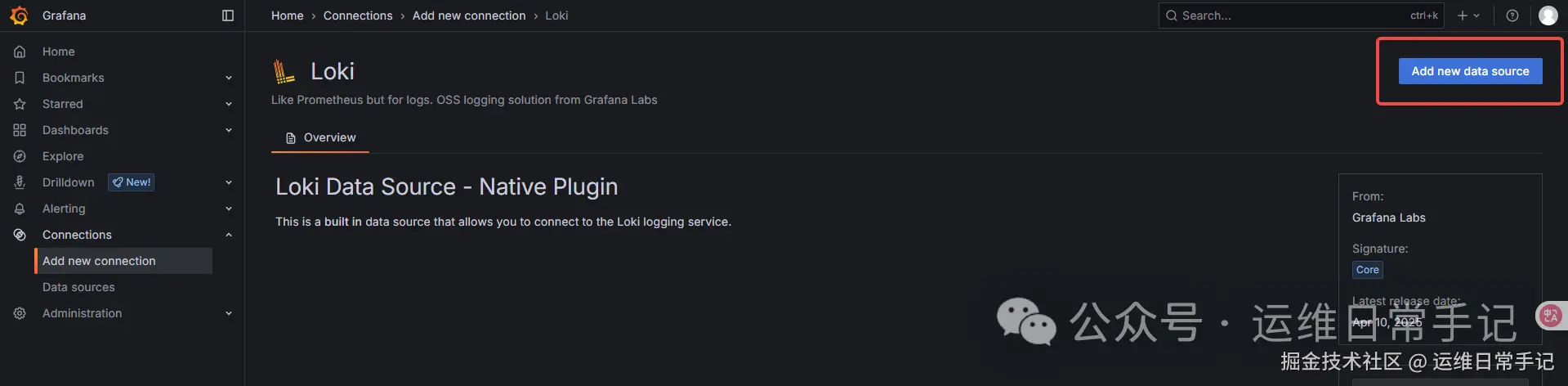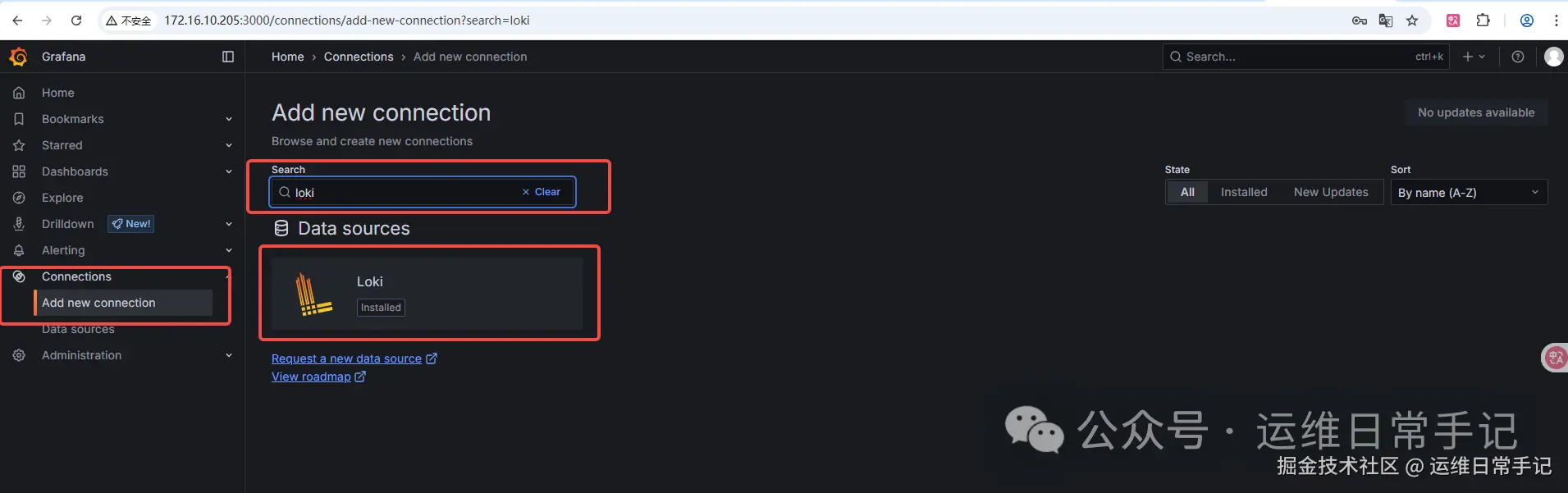 添加loki数据源,浏览器访问grafana(集群任意节点ip加3000端口),用户名是admin,密码是上一步获取的密码,登录后添加数据源。