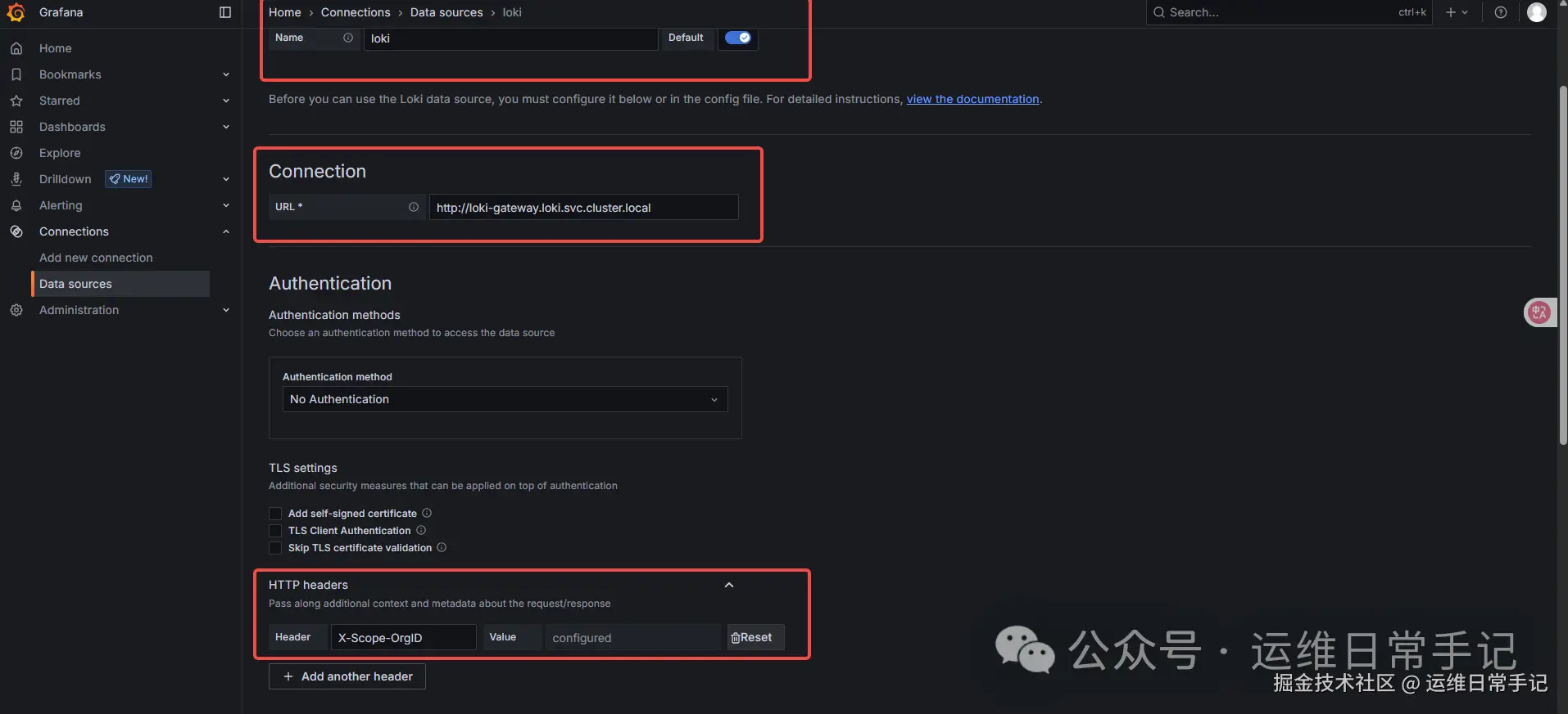 编辑添加数据源,name按需要填写url输入loki-gateway.loki.svc.cluster.local,注意要添加一个header,key为X-Scope-OrgID,值可以随意,然后点击下方测试并保存按钮即可。