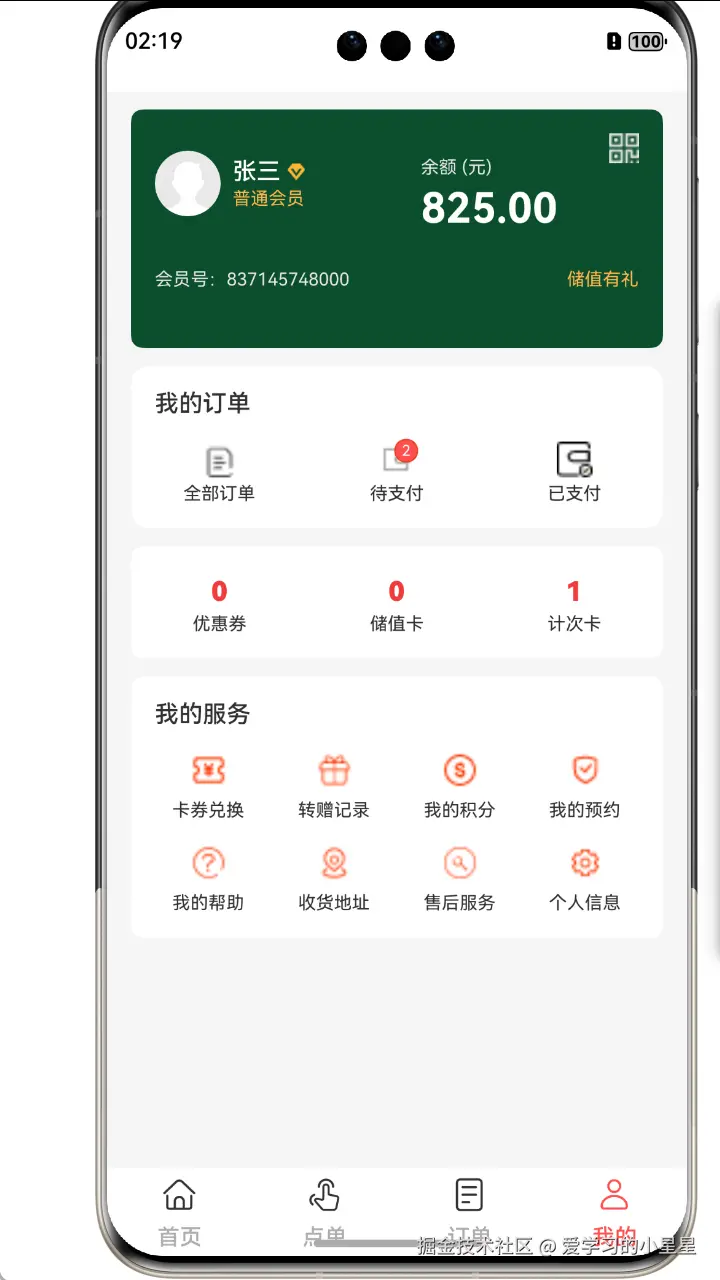 点击左上角头像可退出登录,点击【储值有礼】可进行金额充值,我的订单点击可跳转相应的页面,我的服务模块分别能跳转到指定的页面