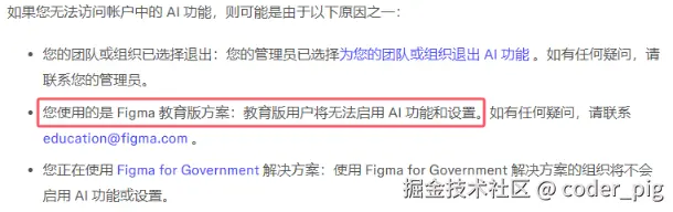 🤡 归根结底:工具是"术",设计理论是"道" ,关于道我一点 经验积累 都没有,这需要大量的看和模仿练习。自己画不出来,但是画得好不好看,我是能评判的,突然有一个想法:🤔 能不能让 AI 出 线框图,我再自己调整和细化?😳 Figma 是有AI功能的,但现在只有 付费用户 能用,白嫖教育版 没法耍咯: