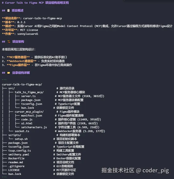 😄 不难看出这个MCP主要由三部分组成:MCP服务、WebSocket通信、Figma插件,对具体实现感兴趣的童鞋,可以自行看下生成的文档:
