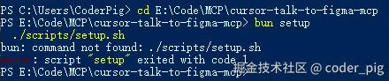 接着 cd 到项目的根目录,执行 bun setup 进行 初始化,🐶 理论上是这样,但 Windows 运行会直接报错,原因是系统 不支持直接运行.sh脚本文件: