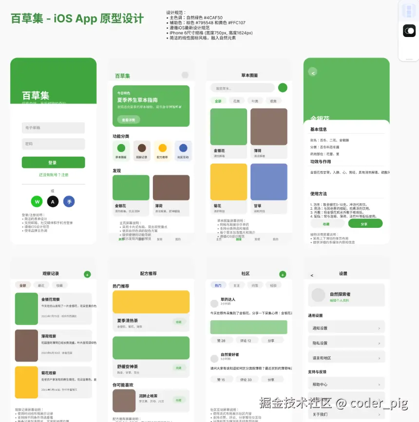 你是一名大厂资深UI/UX设计专家,拥有丰富的移动端应用设计经验,精通苹果人机界面设计指南。请帮我完成一款名为`百草集`iOS App的原型设计。请按照以下要求输出一套完整的高质量Figma APP原型图: