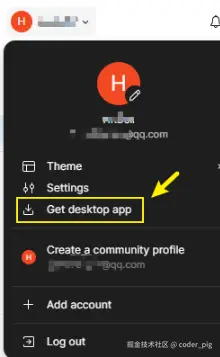 点击用户头像,下拉找到 Get desktop app 进行下载安装: