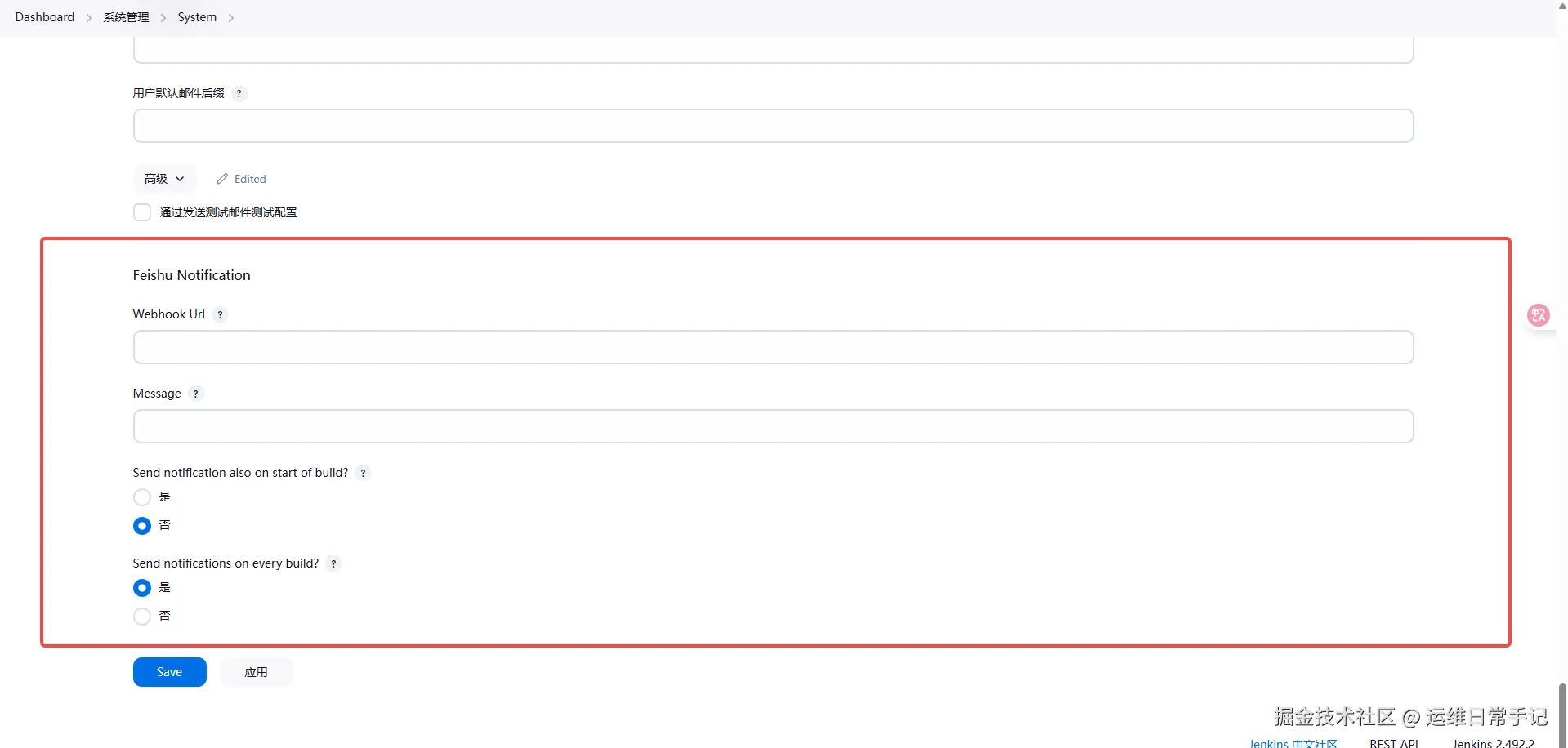 我们定义了webHookUrl和message两个属性,这两个属性可以在Jenkins的UI上面配置,定义了一个send方法,send方法主要是定义发送消息的逻辑,onStarted和onCompleted方法则是调用send方法实现消息发送,注意到perform方法,perform是在流水线执行完成后自动触发的方法,因为我们希望流水线启动和完成都可以触发飞书通知,所以此处的perform方法不做任何处理直接返回true。