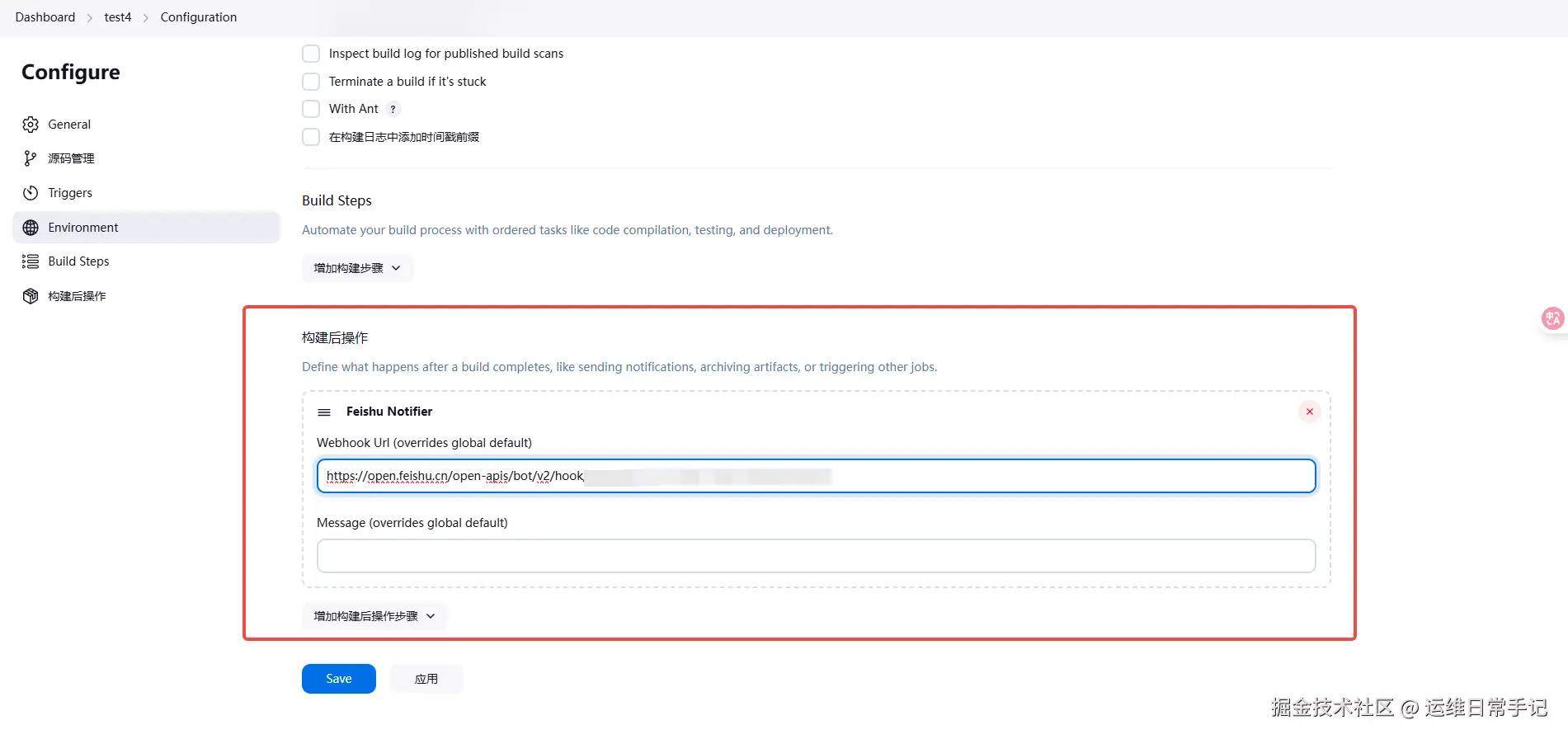 添加构建后操作选择飞书插件,输入webhook地址,message可以不填
