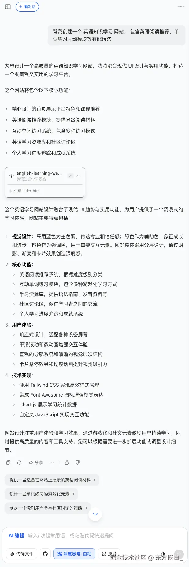 豆包编程在生成前,会简单梳理网站功能,然后进入到代码生成状态;经过一段时间的生成后,完整正提供了一个功能丰富、排版合理、UI美观的页面,我对此简直大为震惊;这个作为一个产品 or 功能站点的前端,基本可以直接复制代码使用了;我看前两天doubao1.6 模型发布,不知道豆包编程底层是不是用的这个模型,效果也太棒了。