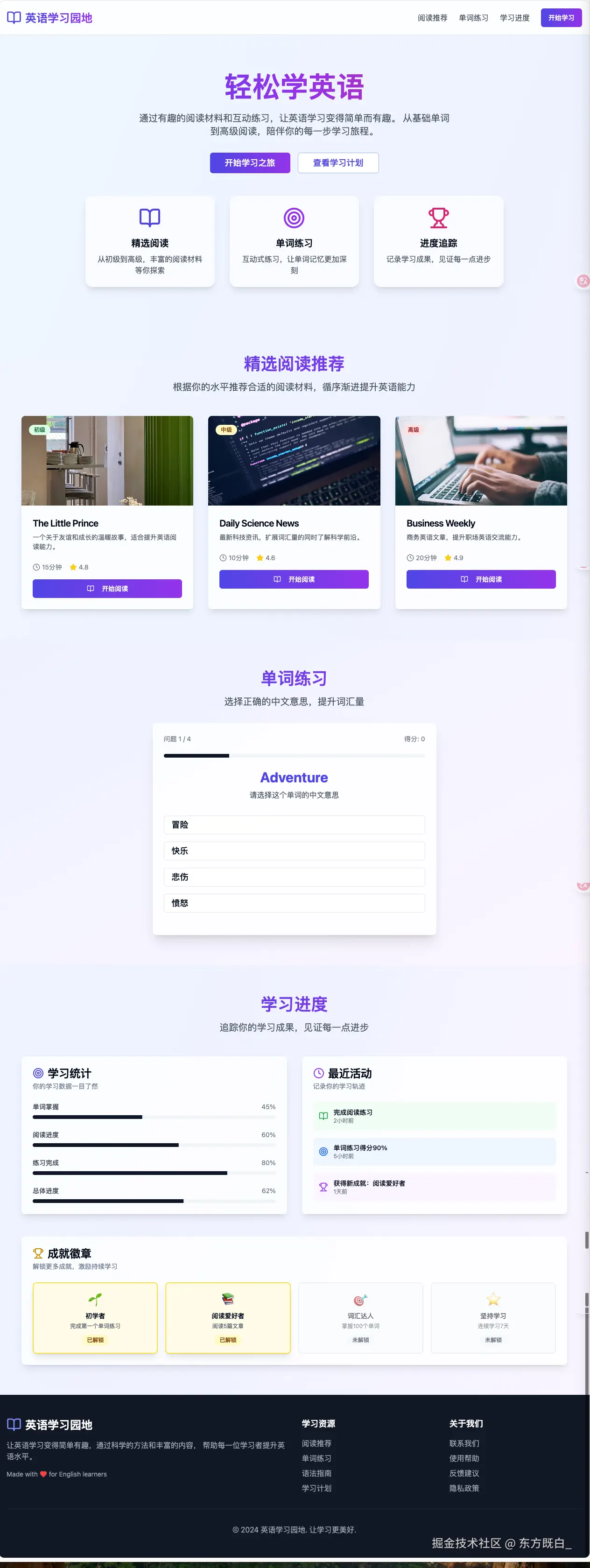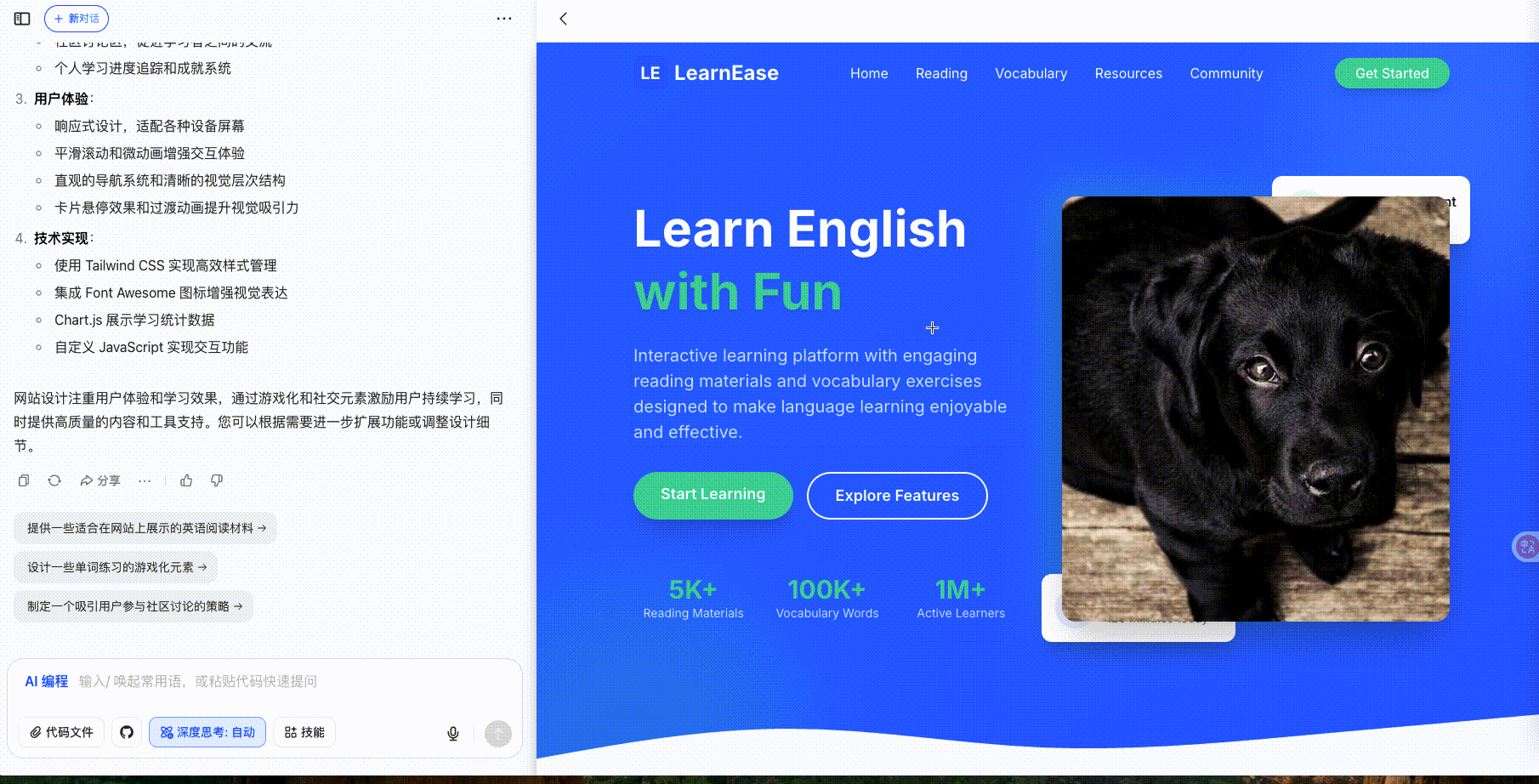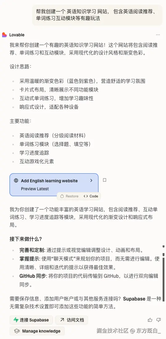 Lovable生成前,AI 会简单的梳理设计思路和功能。实际执行后,能够完整生成一个网页,包含主要的网页元素。功能上包含阅读推荐、单词练习、学习进度、徽章成就等主要功能,复合需求描述;